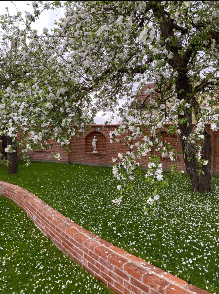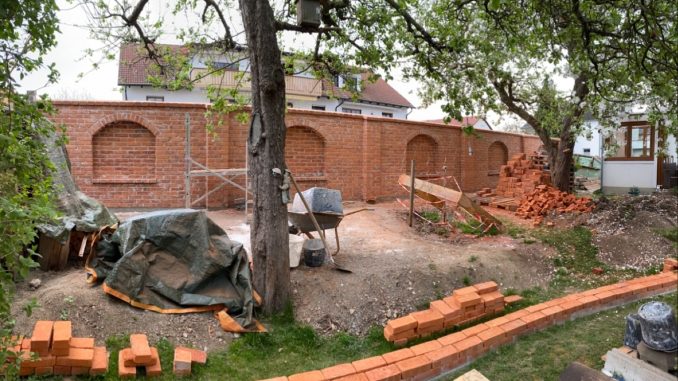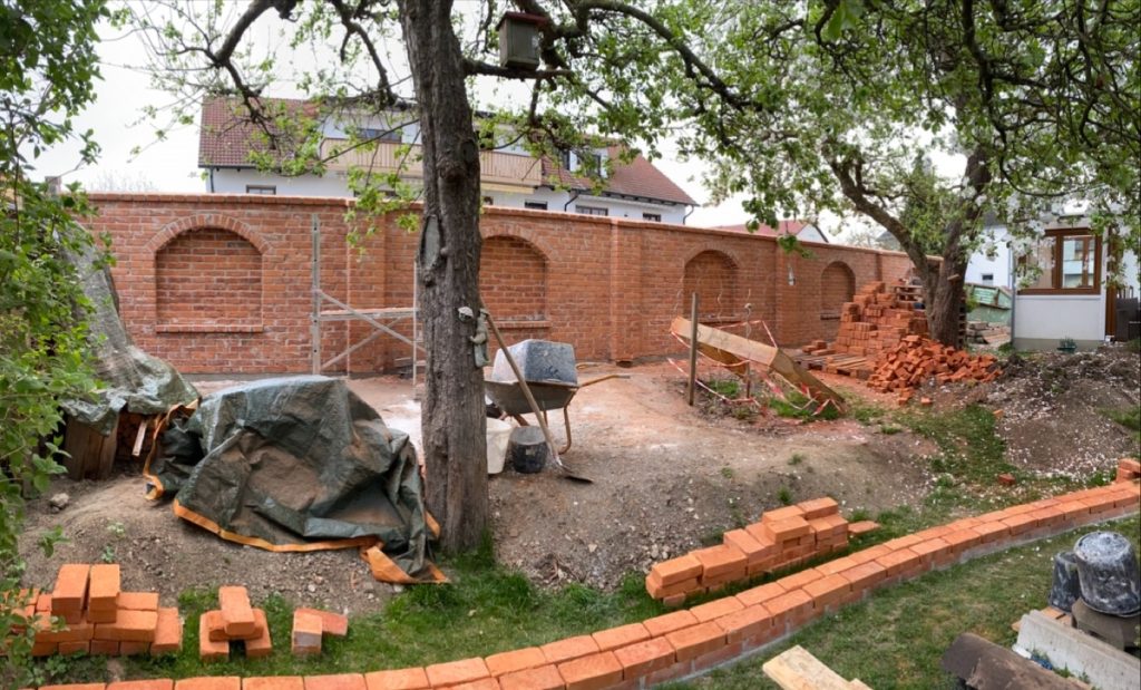 Gartenmauer, der in alten Still aus unseren traditionellen Backsteinen gebaut ist. Ziegelsteine sind aus Ton maschinell geformt und mit Kohle gebrannt. Leicht schattierte, bunte naturrote Farbe ist typisch fuer alle historische Ziegelbauten.